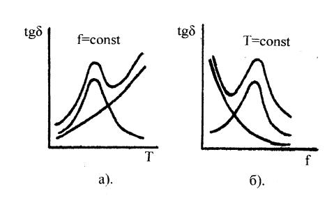 Рост температуры всегда приводит к росту tg за счет увеличения потерь проводимости (рис. 9а). Максимум на суммарной кривой потерь часто не фиксируется, так как он маскируется высокими потерями проводимости.
