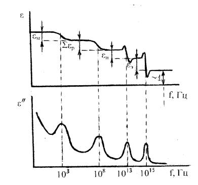 Рис.6. Обобщенная зависимость диэлектрической проницаемости вещества от частоты поляризующего поля (на нижнем графике вместо должно быть tg )