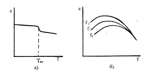 Рис.8. Зависимости относительной диэлектрической проницаемости неполярного (а) и полярного (б) диэлектриков от температуры