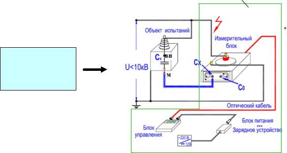 В качестве источника высокого напряжения используется трансформатор (Тр) типа НОМ – 10 (10 / 0,1 кВ), питаемый через регулятор напряжения ЛАТр. Величина испытательного напряжения определяется из соотношения U = Ктр U1, где U1 – напряжение на первичной стороне трансформатора, определяемое с помощью вольтметра V (Ктр - коэффициент трансформации) либо на экране блока управления мостом.