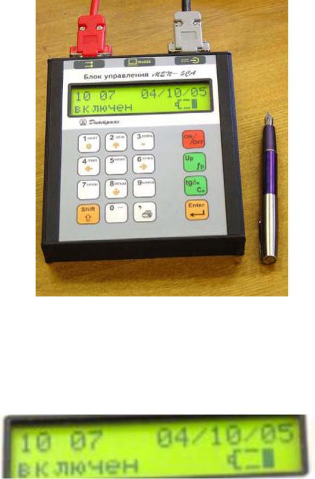 5.Нажать красный тумблер на зарядном устройстве. При включении тумблера загорается светодиод зеленого цвета и жидкокристаллический экран на блоке управления (БУ).