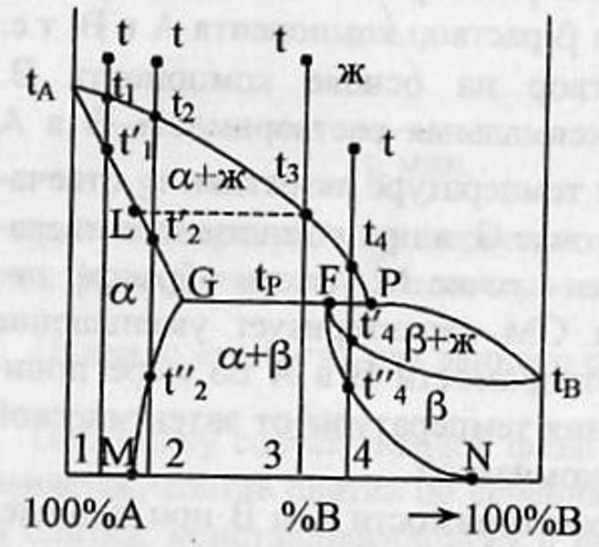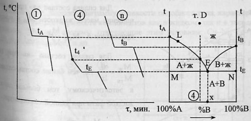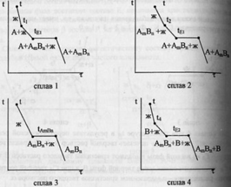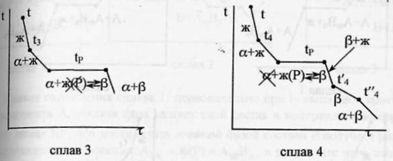 В результате этого взаимодействия образуется новая тв.фаза.Кривые охлаждения 4 сплавов-1,2,3,4. Кривые охлаждения 1 и 2 полностью похожи на эвтектические.
