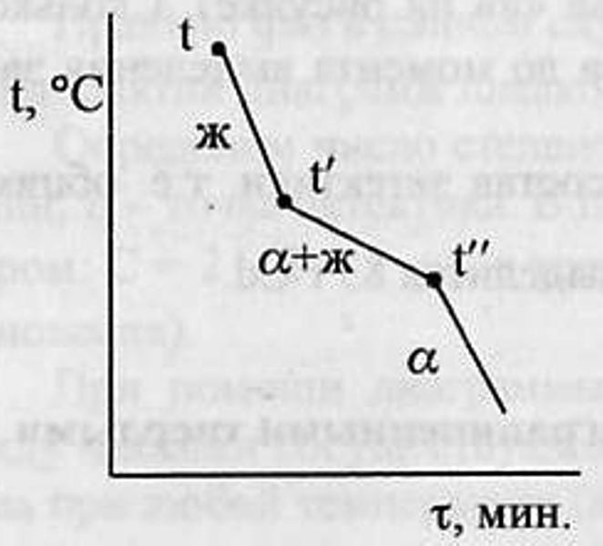 На кривой охлаждения сплава 1 имееются 2 перегиба,отвечающих началу и концу выделения кристаллов тв.р-ра α.
