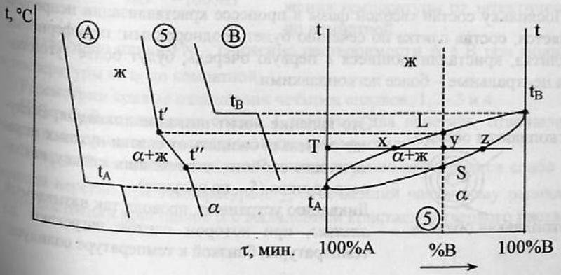 Рассмотрим ход кристаллизации сплава состава 5, взятого при t. В интервале t-t’ никаких фазовых превращений не наблюдается,t меняется монотонно. При достижении t’ из жидкого сплава начинают кристаллизоваться кристаллы α состава N, т.е. первые порции тв.фазы обогащены более тугоплавким компонентом. В равновесии находятся твердые и жидкие фазы различного состава, отсюда и отсутствие площадок на кривых охлаждения.