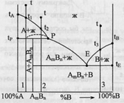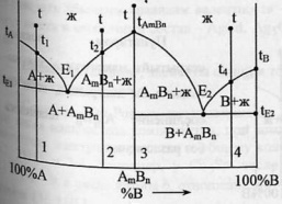 Систему А-В можно представить как бы состоящей из 2 простейших эвтектических диаграмм, где роль одного из компонентов играет устойчивое химическое соединение AmBn.