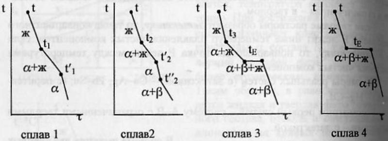 Кривые охлаждения четырех сплавов.