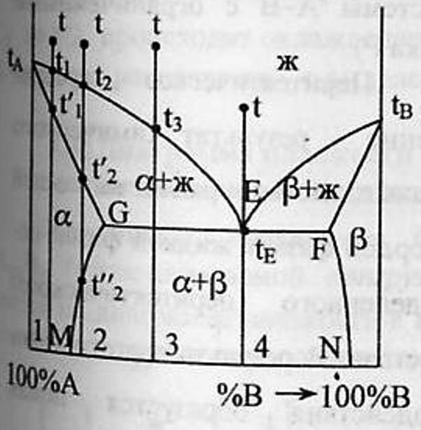 Max растворимость В в А при t эвтектики tЕ отвечает точке G, а при комнат.t – точке M.