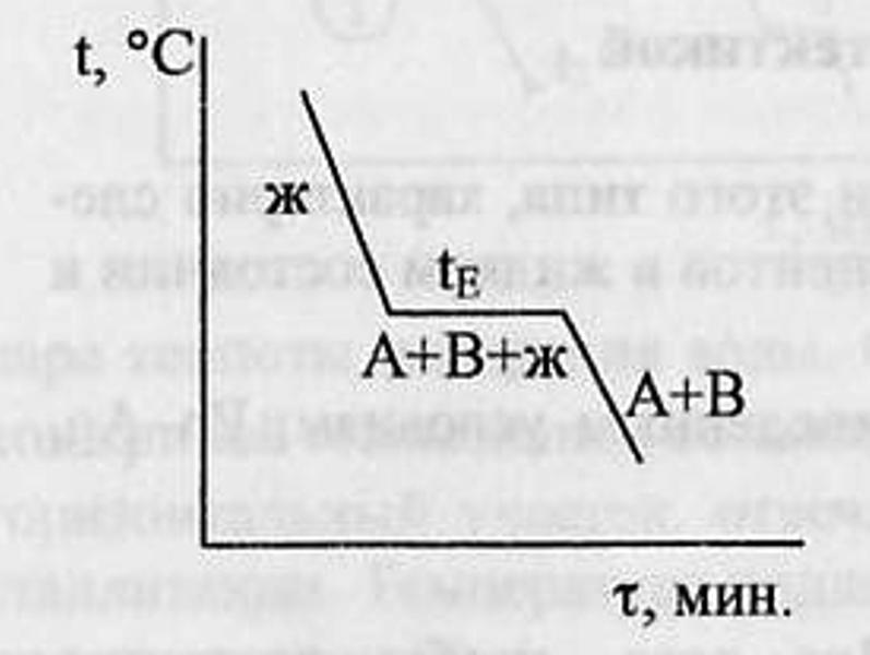 Точка Е – точка эвтектики, сплав эвтектического состава кристаллизуется подобно чистому компоненту, давая кривую охлаждения с площадкой: для сплавов, имеющих состав 100%А до т. х (состава эвтектики) – так называемых доэвтектических – под микроскопом после затвердевания наблюдаются сравнительно крупные кристаллы компонента А, выпадающие первоначально, и смесь мелких кристалликов А и В, выпадающая при достижении жидкой фазы эвтектического состава – в конце кристаллизации.