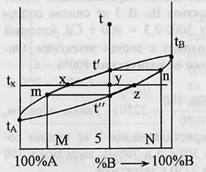 При понижении от t’ до t” состав твердой фазы меняется по линии nt”, а состав жидкой фазы- по линии t’m.