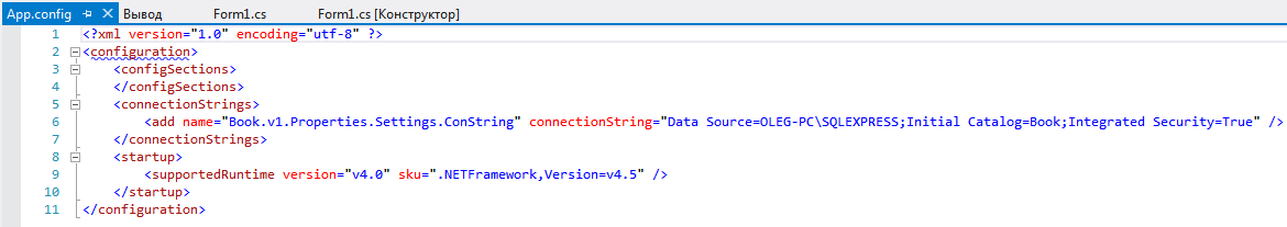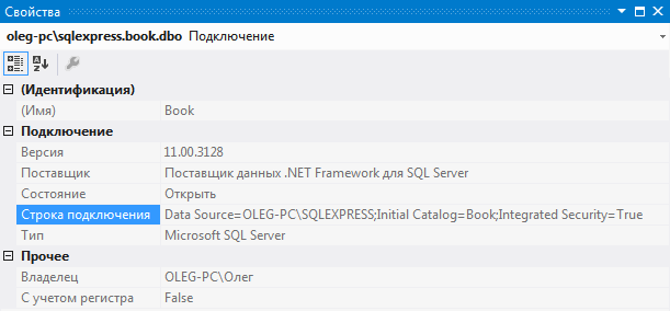 Значение – Data Source=OLEG-PC\SQLEXPRESS; Initial Catalog=Book; Integrated Security=True.