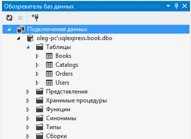 После нажатия кнопки OK в узле Подключения данных окна Обозреватель баз данных будет добавлено подключение к БД Book. Под значком подключения расположены каталоги для объектов базы данных (рис. 6).