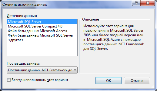 В появившемся диалоговом окне Добавить подключение необходимо указать имя сервера, тип SQL-аутентификации и название базы данных (рис. 3). Окно Добавить подключение (Add Connection) позволяет выбрать провайдер данных. При нажатии кнопки Изменить (Change) появится диалоговое окно Сменить источник данных (Change Data Source), которое предоставляет список провайдеров для подключения к базе данных (рис. 4).