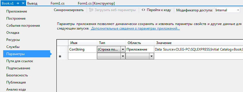 В реальных приложениях строку соединения не задают жестко в коде программы, а выносят во внешний файл настроек приложения. Откройте окно свойств проекта и выберите вкладку Параметры (Settings).