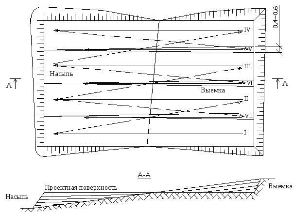 По этой схеме бульдозером около нулевой линии нарезается грунт и отсыпается сразу за нулевой линией слоем толщиной до 40 см. Для каждой новой проходки бульдозер при обратном (заднем) ходе сдвигается в сторону, чтобы обеспечить равномерную загрузку на бульдозер (резание обоими краями отвала), т.е. между смежными проходками оставляется гребень шириной 0,5-1,0 м.