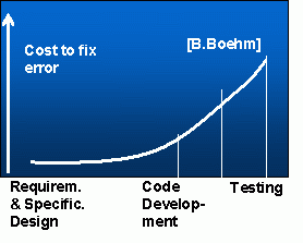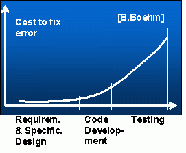 Широко відома оцінка розподілу трудомісткості між фазами створення програмного продукту: 40%-20%-40% (Рис. 1.1), із чого можна зробити висновок, що найбільший ефект у зниженні трудомісткості може бути отриманий насамперед на фазах Design й Testing. Тому основні вкладення в автоматизацію або генерацію коду варто здійснювати, насамперед, на цих фазах. Хоча в сучасному індустріальному програмуванні автоматизація тестування є широко розповсюдженою практикою, у той же час технологія верифікації вимог і специфікацій поки робить тільки свої перші кроки. Завданням найближчого майбутнього є рух убік такого розподілу трудомісткості (60%-20%-20% (Рис. 1.2)), щоб сумарна ціна виявлення більшості дефектів прямувала до мінімуму за рахунок виявлення переважного числа на найбільш ранніх фазах розробки програмного продукту.
