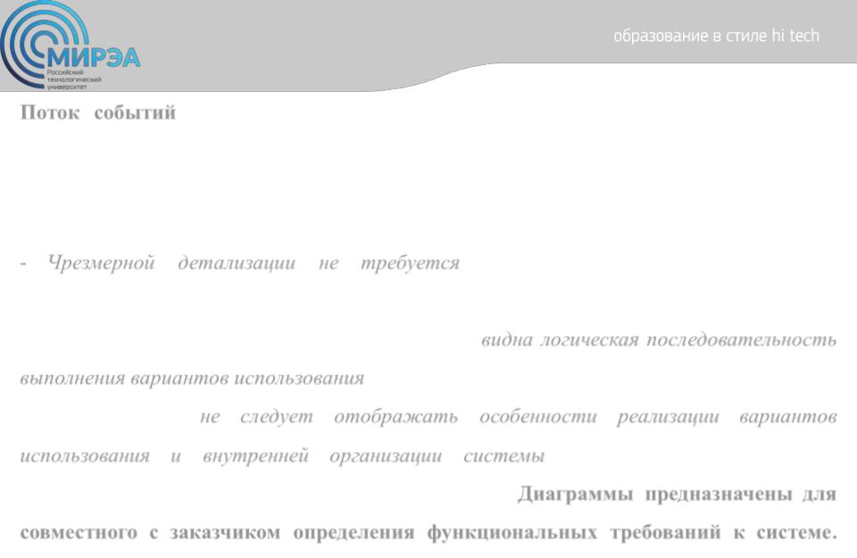 -Чрезмерной детализации не требуется, т.е. диаграмма не должна быть перенасыщена элементами (не более 15 вариантов использования).