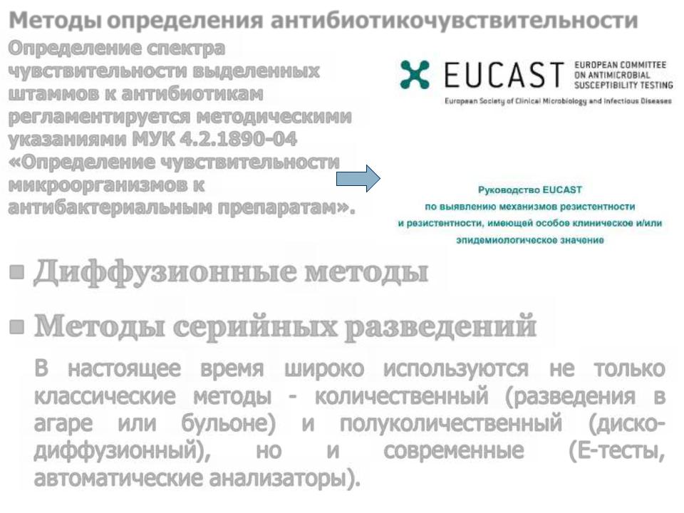 В настоящее время широко используются не только классические методы - количественный (разведения в агаре или бульоне) и полуколичественный (диско- диффузионный), но и современные (Е-тесты, автоматические анализаторы).
