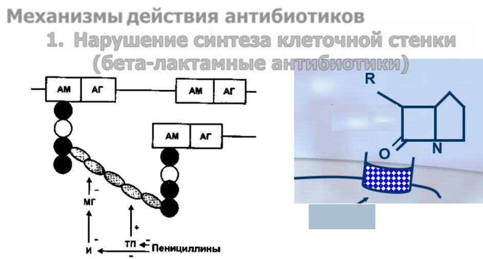 (ПСБ). ПСБ представляют собой трансмембранные или поверхностные белки в цитоплазматической мембране. Связываясь с ПСБ, антибиотик ингибирует фермент ТРАНСПЕПТИДАЗУ, которая участвует на последних