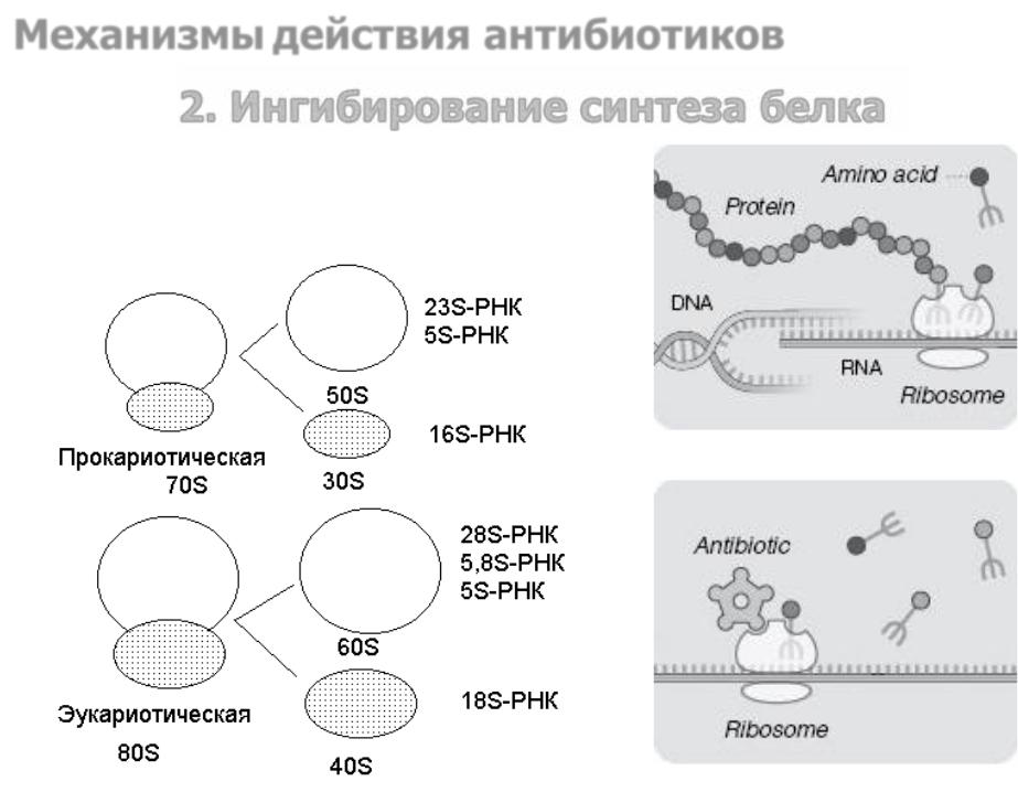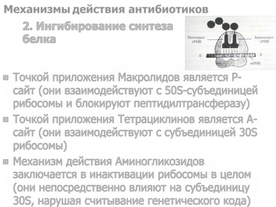 Механизм действия Аминогликозидов заключается в инактивации рибосомы в целом (они непосредственно влияют на субъединицу 30S, нарушая считывание генетического кода)