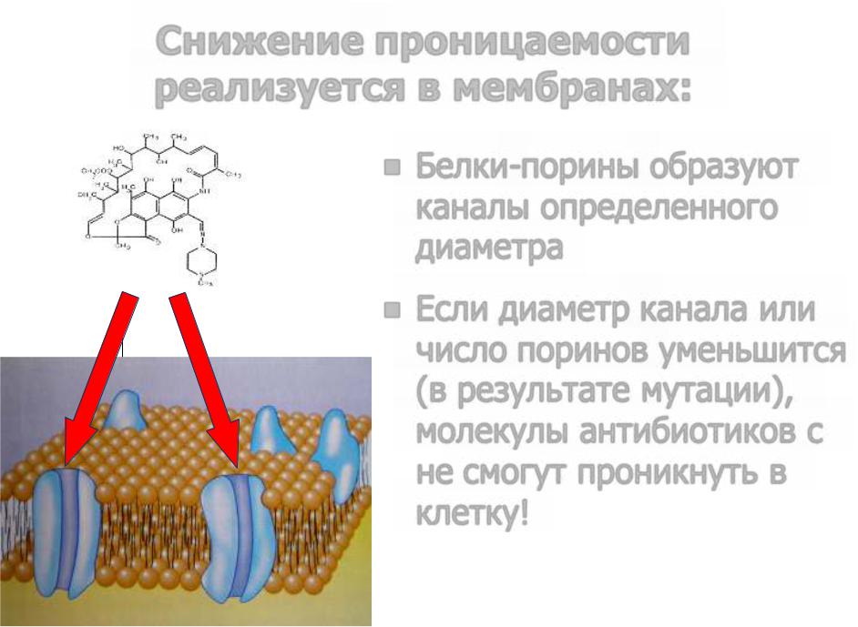 Если диаметр канала или число поринов уменьшится (в результате мутации), молекулы антибиотиков с не смогут проникнуть в клетку!