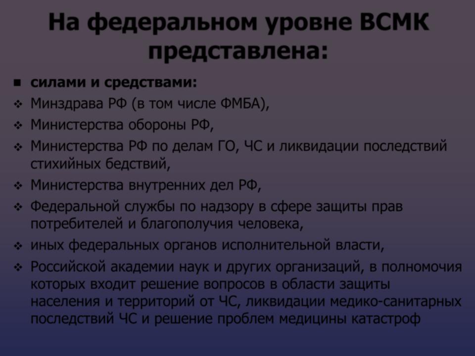 На федеральном уровне ВСМК представлена: