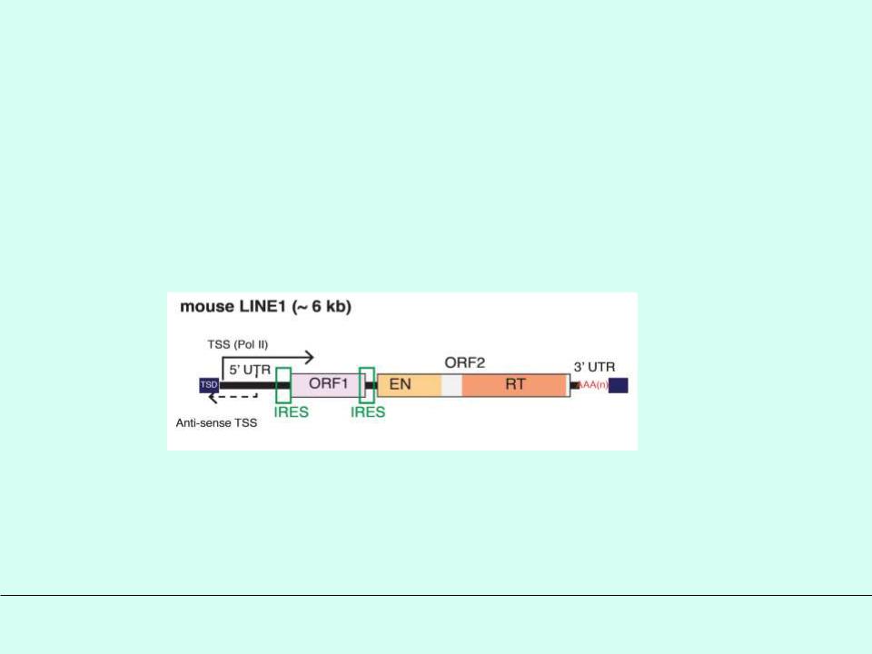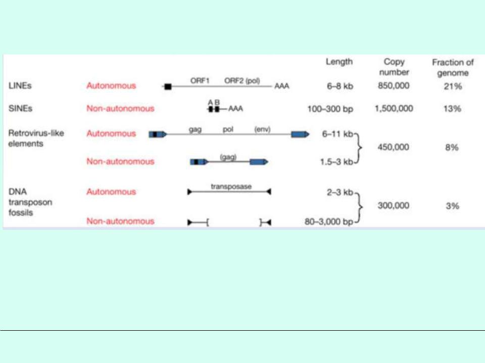 (например, Alu (350 bp) у чел-ка >1 млн, ~5-15% у млекопит.) LINE-(Long - // - , ~6 kb, например, у человека около 500 000 ~ 21% )