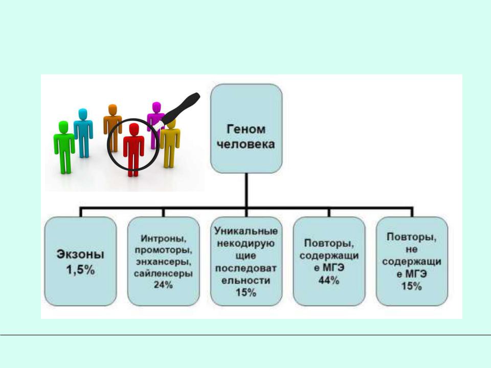 Структура генома человека: повторы и мобильные генетические элементы (МГЭ ~45%)