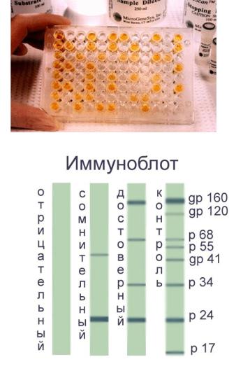 Иммуноблот чаще применяют как подтверждающий тест для выявления антител к отдельным белкам ВИЧ. Антитела к основным внутренним белкам (р17, р24) обнаруживают у 70% инфицированных и примерно у половины больных СПИДом. В иммуноблоте чаще всего выявляются антитела к gp41 (до 85%)
