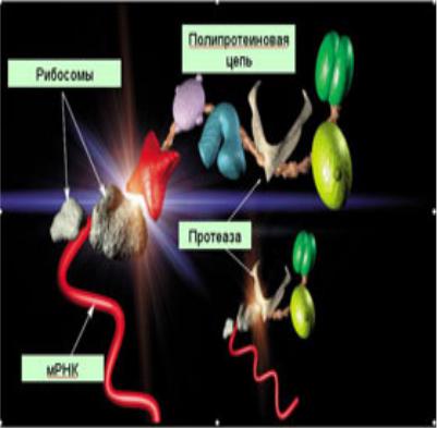 •На вирусной матричной РНК клеточные рибосомы осуществляют синтез вирусных белков. Образование полипротеина и нарезание его при помощи фермента протеазы