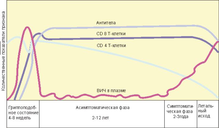 •Развитие иммунодефицита , гибель Т4 клеток.