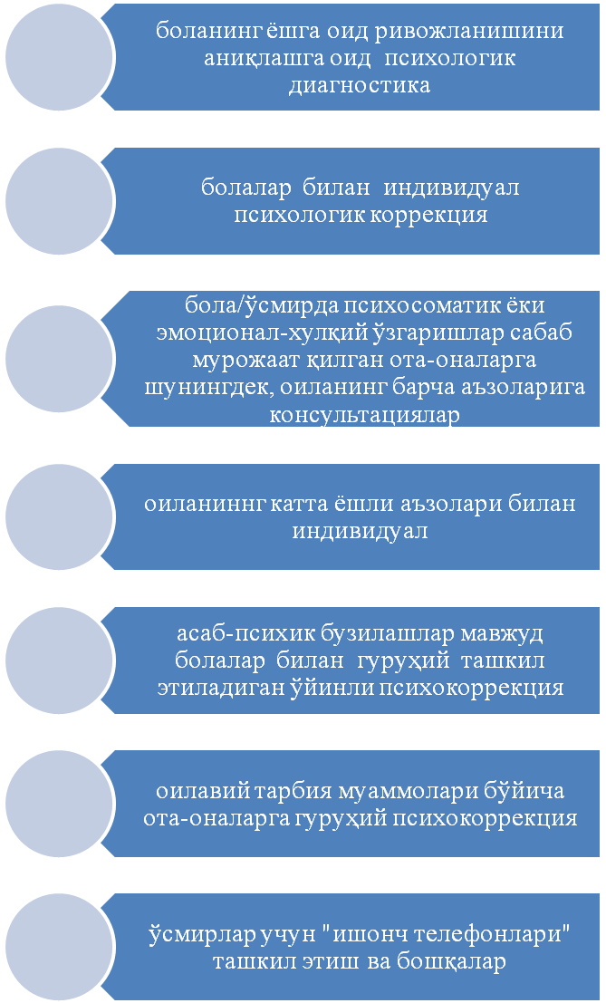 Мазкур йўналиш бўйича фаолият кўрсатувчи психологлар дастлабки фаолияти таҳлилининг кўрсатишича1, пациентларга психологик хизматни ташкил этиш учун логопед ва невропотолог консультациясига юборилган йўлланма асос қилиб олинган.