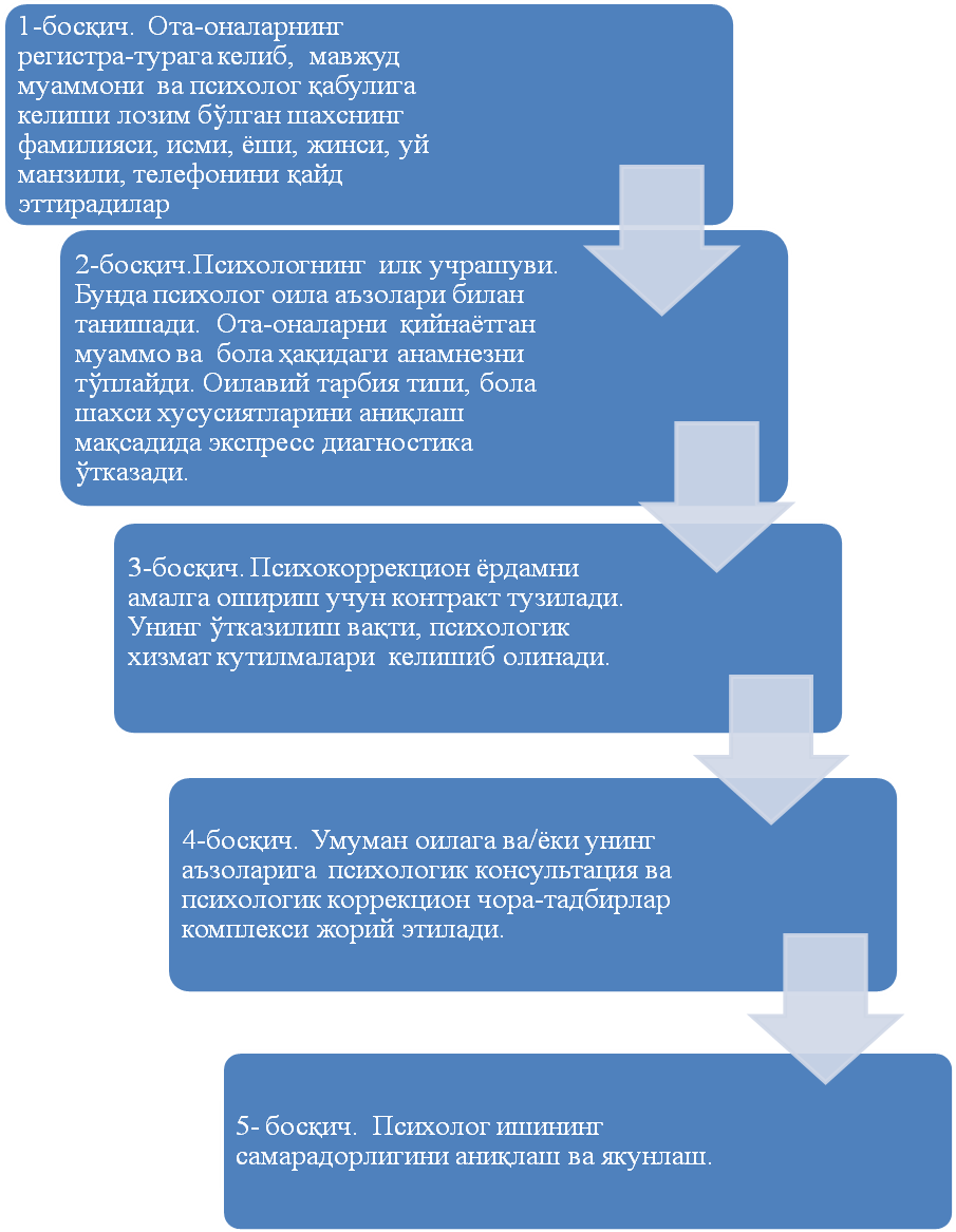 Биринчи босқичда ота-оналар поликлиникага келиб рўйхатдан ўтиб, психолог қабулига кириши лозим бўлган шахснинг барча маълумотларини қайд қилади. Пациентларни қабул қилишнинг иккинчи ва учинчи босқичлари одатда икки маротаба учрашувлардан иборат, тўртинчи босқич эса давомийлиги ва учрашув интервалларининг турлича бўлиши билан кечади. Бу ота-оналарнинг бола/ўсмир ҳақидаги фаол қизиқишлари ва хоҳиш-истаклари шунингдек, бола/ўсмирлардаги ижобий ўзгаришлар темпига боғлиқ тарзда амалга оширилади. Бешинчи босқичда психологик коррекцион тадбирларнинг натижалари таҳлил қилинади. Барча ўтказилган консультатив сеанслар, машғулотлар ва уларнинг натижалари махсус журналга қайд қилиниб, ота-оналарга, педагогларга, тиббиёт ходимларига берилган тавсиялар тўлиқ ёзилиб борилади.