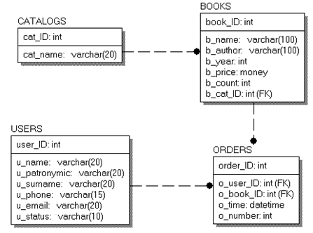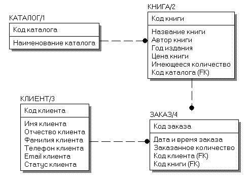 Логическая модель данных предметной области в стандарте IDEF1X представлена на рис. 1. Выделены сущности КАТАЛОГ, КНИГА, КЛИЕНТ, ЗАКАЗ, между которыми установлены неидентифицирующие связи мощностью oдин-ко-многим, определяемые спецификой предметной области.