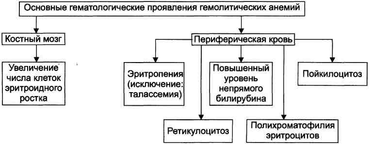 Рис. 21–8. Основные гематологические проявления гемолитических анемий.