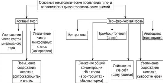 Рис. 21–10. Основные гематологические проявления гипо‑ и апластических дизэритропоэтических анемий.