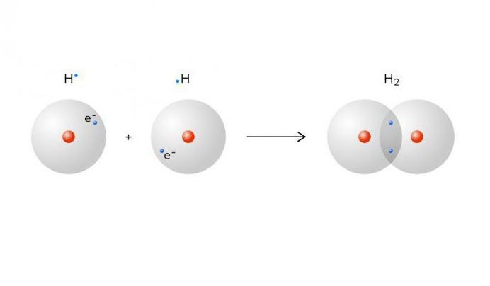Рис. 1 Ковалентная связь, формирующая молекулу водорода H2 (справа), где два атома водорода перекрывают два электрона