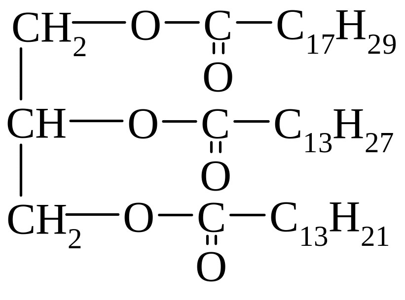 120. Для определения ненасыщенности жира проводят его реакцию с йодом. Укажите количество молекул йода, которое может присоединить жир следующего строения: