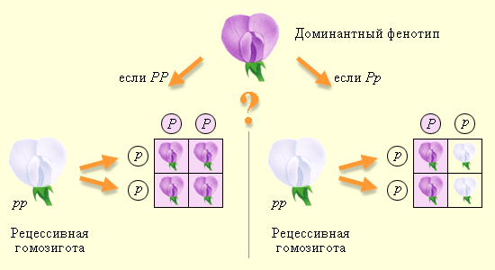 А)Анализирующее скрещивание — скрещивание гибридной особи с особью, гомозиготной по рецессивным аллелям, то есть "анализатором". Смысл анализирующего скрещивания заключается в том, что потомки от анализирующего скрещивания обязательно несут один рецессивный аллель от "анализатора", на фоне которого должны проявиться аллели, полученные от анализируемого организма. Для анализирующего скрещивания (исключая случаи взаимодействия генов) характерно совпадение расщепления по фенотипу с расщеплением по генотипу среди потомков. Таким образом, анализирующее скрещивание позволяет определить генотип и соотношение гамет разного типа, образуемых анализируемой особью.(Пример:Цветы ночная фиалка!Школьный пример)