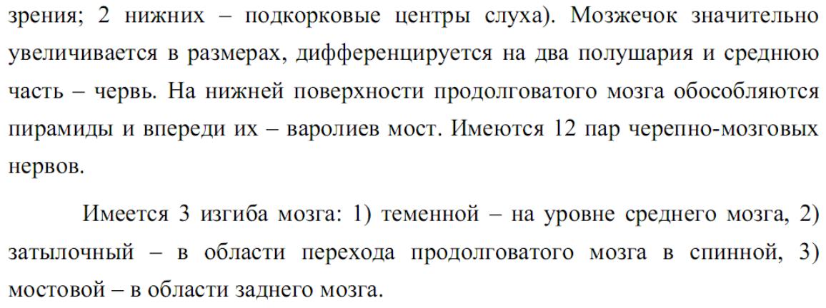 Стадия пяти мозговых пузырей. Передний мозговой пузырь делится на два отдела: передний и промежуточный. Средний мозговой пузырь не делится. Задний мозговой пузырь делится на два отдела: задний и продолговатый. Продолговатый мозг без резкой границы переходит в спинной мозг.