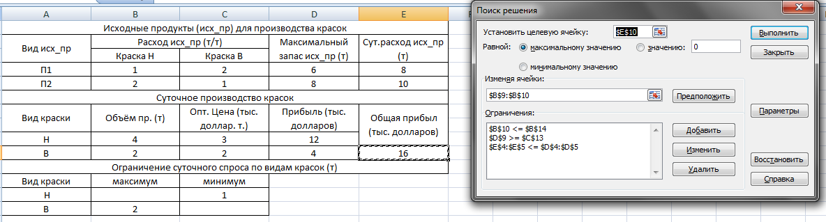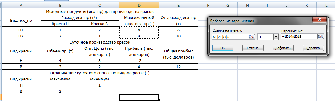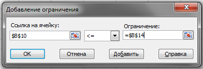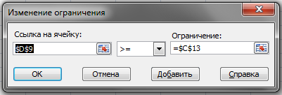 Хорошим стилем оформления задания на поиск решения является использование ограничений, левые и правые части которых состоят только из имени (адреса) одной ячейки или массива ячеек. При этом все промежуточные вычисления, связанные с определением левой и правой частей таких ограничений размещаются в зависимых ячейках таблицы. (Последние версии EXCEL не допускают отклонений от этого стиля). Сложение – одна ячейка, число должно быть размещено в ячейке и на него уже ссылка в условии