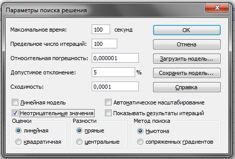 В этом случае для решения проблемы придется сбросить флажок Линейная модель и решать задачу с использованием более сложных и менее эффективных алгоритмов нелинейного программирования.