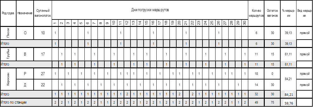 Календарный план погрузки отправляемых маршрутов рекомендуется разрабатывать по форме, приведенной в таблице 2.1. При разработке плана необходимо предусматривать равномерную работу грузовых пунктов с тем, чтобы общее количество ежесуточно отправляемых маршрутов на каждом из них было примерно одинаковым. Целесообразно также обеспечить равномерную в течение месяца работу станции в целом.
