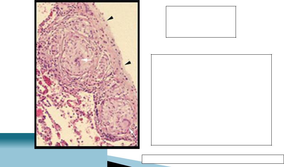 Расположение этой гранулёмы типично, она прилегает к плевре. Внутри центрального скопления эпителиоидных клеток и оправы из лимфоцитов расположены гигантские клетки (белая стрелка).