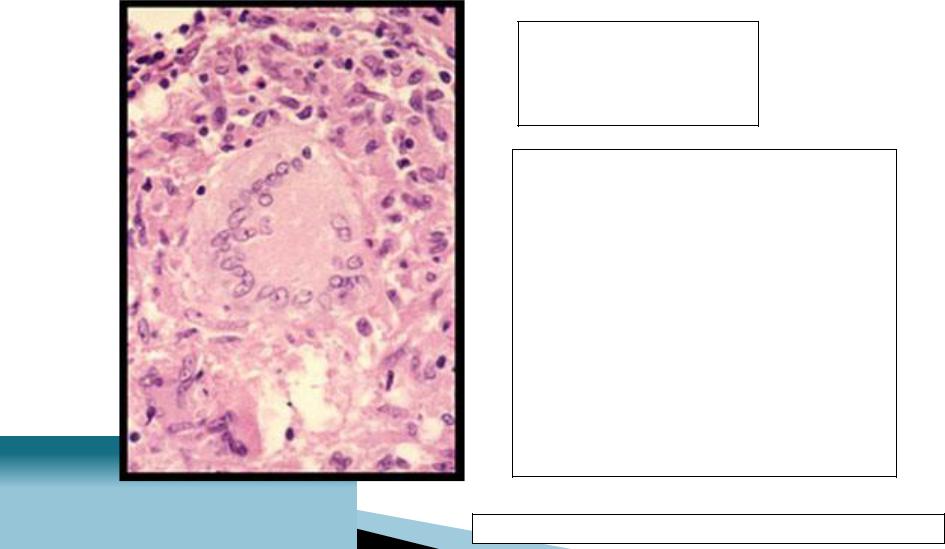 Гиганская клетка Пирогова– Лангханса в центральной части этой гранулёмы окружена эпителиоидными клетками.