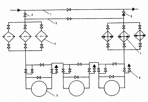 Рисунок 2.2 – Технологическая схема компрессорной станции с центробежными нагнетателями: 1 – магистральный газопровод; 2 – кран; 3 – байпасная линия; 4 – пылеуловитель; 5 – газоперекачивающий агрегат; 6 – продувные свечи; 7 – АВО газа; 8 – обратный клапан