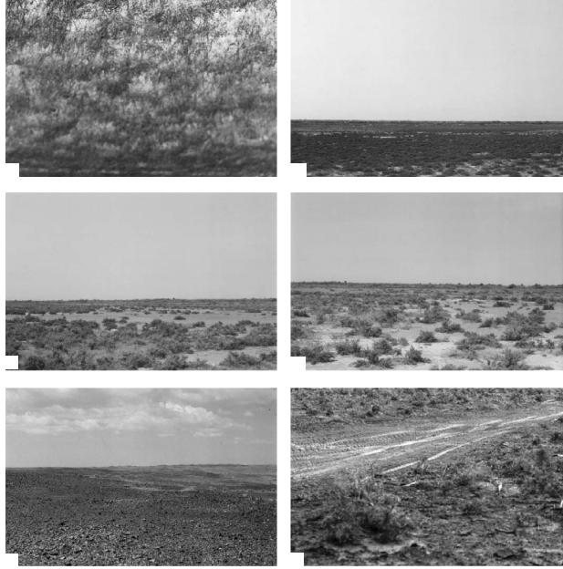 Рис. 1. Наземные индикаторы деградации (А, Б) и опустынивания (В, Г, Д, Е) почвенного покрова: А – солончаки лу говые, Б – солончаки типичные, В – соровые солончаки, Г – голые солончаки, Д – дефлированные пески, Е – грун товые дороги.