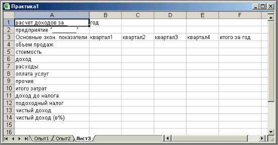 3.Оформите документ надлежавшим образом, отделив заголовочную часть от расчетной – табличной пустой строкой. Внутри таблицы целесообразно отделить друг от друга разные типы данных (показатели Доход и Расходы:, Итого затрат и Чистый доход (в %)).