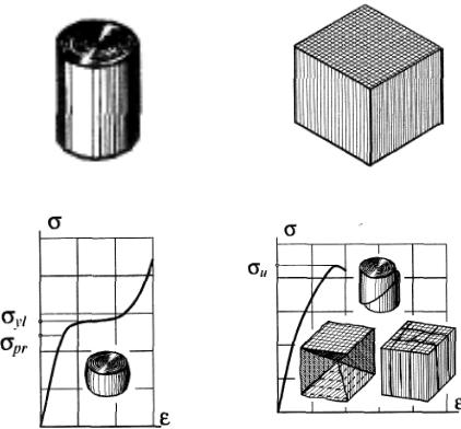 роткие образцы в форме цилиндров (рис. 5,а в основном для металлов) или кубиков (рис. 5,б для бетона, древесины и т.п.), иногда параллелепипедов. При большой высоте образца его сжатие обычно сопровождается искривлением, что искажает результаты испытаний.