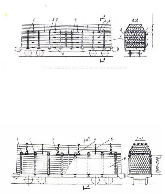 аполовина – в іншу. Комлі та верхівки колод у “шапці” повинні чередуватися поштучно. Крайні колоди в рядах, які лежать на прокладках, повинні обов’язково прилягати до стояків, прокладки опиратися на середні і крайні колоди, що прилягають до стояків. Круглий ліс у прямокутній частині габариту навантаження розміщується у двох або більше штабелях до висоти 2,4-2,5м від підлоги вагона. У верхній звуженій частині габариту навантаження укладають ліс “шапкою” висотою не менше 1200мм. Для ув’язування круглого лісу, укладеного в “шапку”, застосовують шестиланкові стяжки і додатково закріпляють “шапки” поперечною обв’язкою із дроту.