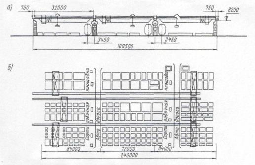 Рис. 10.21 Відкрита площадка для зберігання металів і металопрокату, обладнана мостовими кранами: а – поперечний перетин; б – план